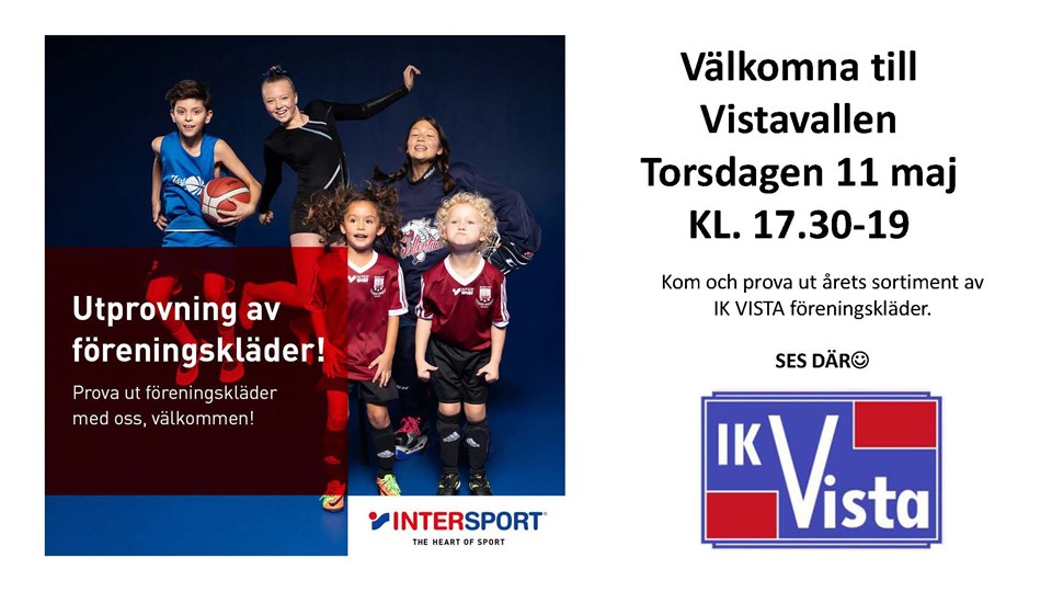 Hej! Intersport kommer ut till Vistavallen på torsdag 11 maj mellan kl. 17.30-19.00, då finns möjlighet att prova IK Vistas föreningskläder för fotbollen.