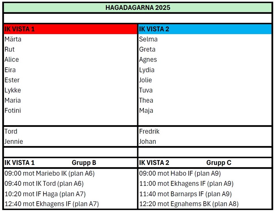Hej alla pigga och utvilade tjejer och föräldrar. Vad kul det var att starta upp i lördags med alla som närvarade under träningen. Nu på lördag (16/8) är det ingen träning pga Hagadagarna och VIsta-dagen. Lite matnyttigt om Hagadagarna 17/8: Samling strax efter 08.30 ute på Strömsbergsvallen, båda lagen har sin första match vid 09.00. Kommer vara lite parkeringskaos i sann Cup-anda så försök vara ute i god tid. Vi kommer som vanligt sätta upp ett litet Camp efter bästa förmåga vid plan A6/A9. På Hagadagarnas hemsida finns det info om parkeringar, mat, övriga aktivitet och lite översiktskartor för alla nyfikna. (www.cupmate.nu/cup/hagadagarna) Hagadagarna 2025 - Praktisk information Påminner också om att alla tjejer ska ha benskydd vid matcherna! Har ni några frågor eller dylikt, hojta till. Annars ses vi på söndag (eller under lördagen på Vallen) Allt gott från Tränarna!
