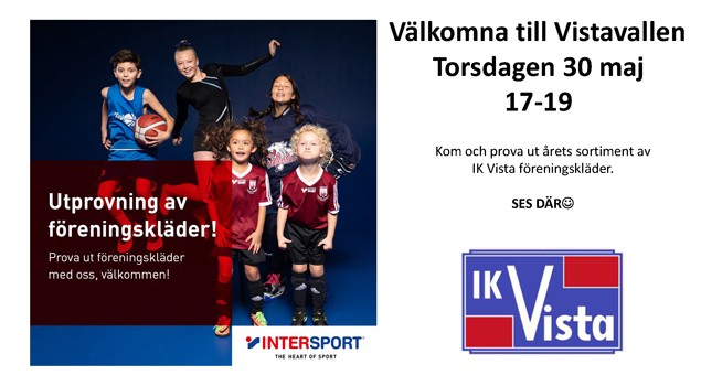 Utprovning föreningskläder (IK Vista) 30/5 Intersport, vår leverantör av utrustning och kläder, bjuder in till utprovning på Vistavallen på torsdag 30/5 kl. 17.00-19.00. Medarbetare från Intersport kommer att finnas på plats och hjälpa till vid utprovningen. F08/09 ÖIS / Vista 15 maj 2024 0kommentarer
